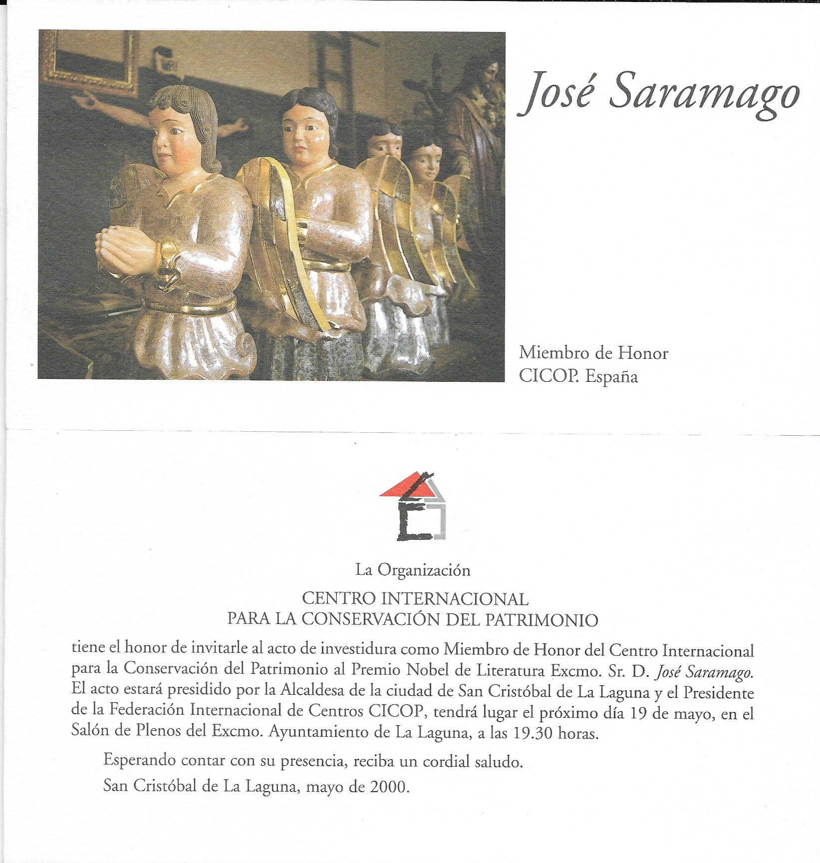 Gracias José Saramago por ayudarnos a comprender que en el centro del proceso de globalización se encuentra el hombre, como sujeto histórico y no como “objeto histórico”, gracias por ayudarnos a comprender que el mundo del siglo XXI sólo puede construirse con el aporte de los valores de todas las culturas, y gracias finalmente en nombre de la Federación de todos los centros CICOP que actualmente trabajan en Argentina, Cuba, Bolivia, Italia, Perú, Paraguay, Portugal y España por aceptar nuestra decisión de distinguirle como miembro de honor de esta organización internacional, que ha establecido en La Laguna su sede que quiere ser punto de encuentro del patrimonio cultural de los pueblos históricamente enraizados con esta comunidad de Canarias.